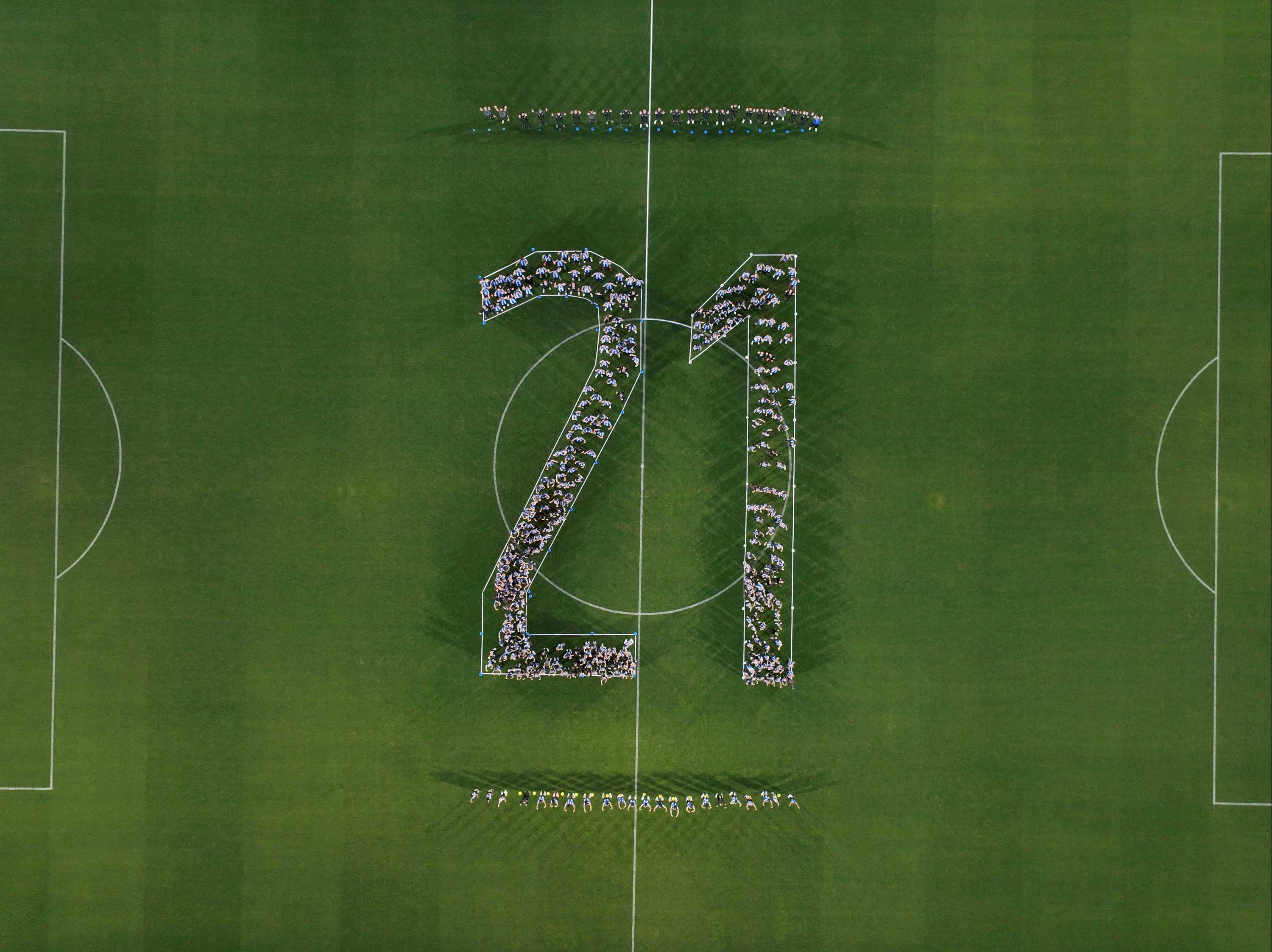 今年是达尼·哈尔克体育城启用第21周年,出席亮相仪式的队员们摆成数字21向达尼·哈尔克致敬。